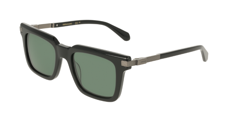 These men's rectangular sunglasses feature a modern, dynamic, and balanced construction, achieved by combining the acetate front with the metal insert on the sides. The temples are finished with an engraved Ferragamo logo and a pattern of linear grooves created through a manual milling process. The Gancini emblem, interpreted from a vertical perspective, is integrated into the hinge to be visible from above. The discreet yet impactful look combines geometric precision with the natural appeal of timeless colorations: Black/Solid Green, Milky Brown Tortoise/Gradient Brown Grey, and Khaki Horn/Solid Grey lenses.